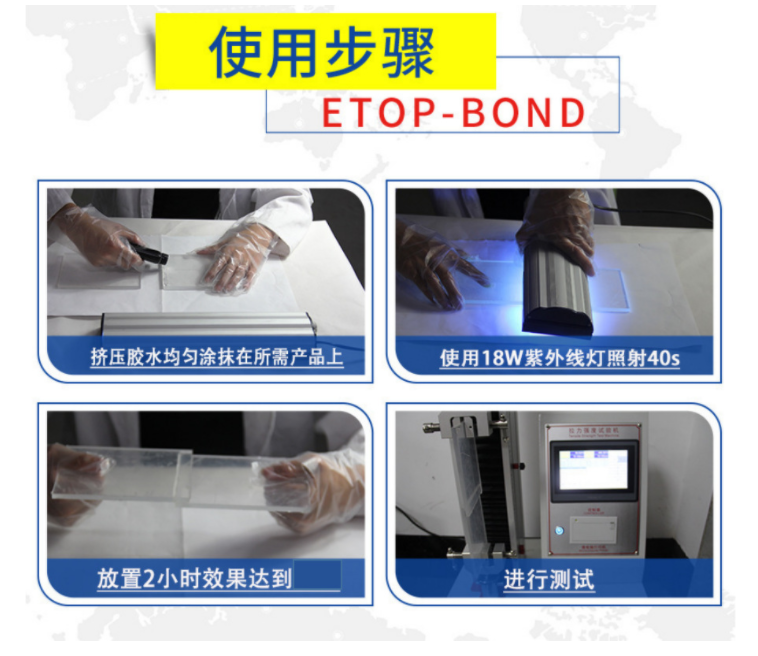 产品简介:UV胶是一种单组份、紫外光固化、丙烯酸酯类胶粘剂。该产品专门针对玻璃粘接而 设计。具有附着力好、坚韧、抗震强、耐候性好等特点。并且胶液具有一定的触变性对施工有很大帮助。